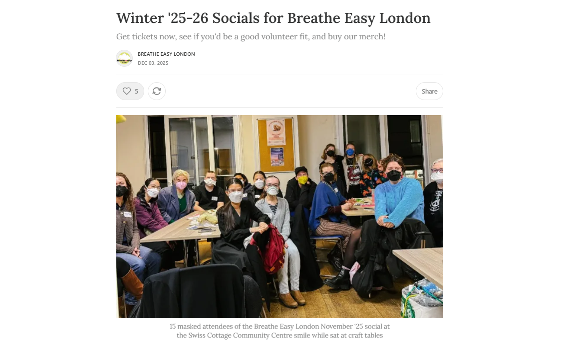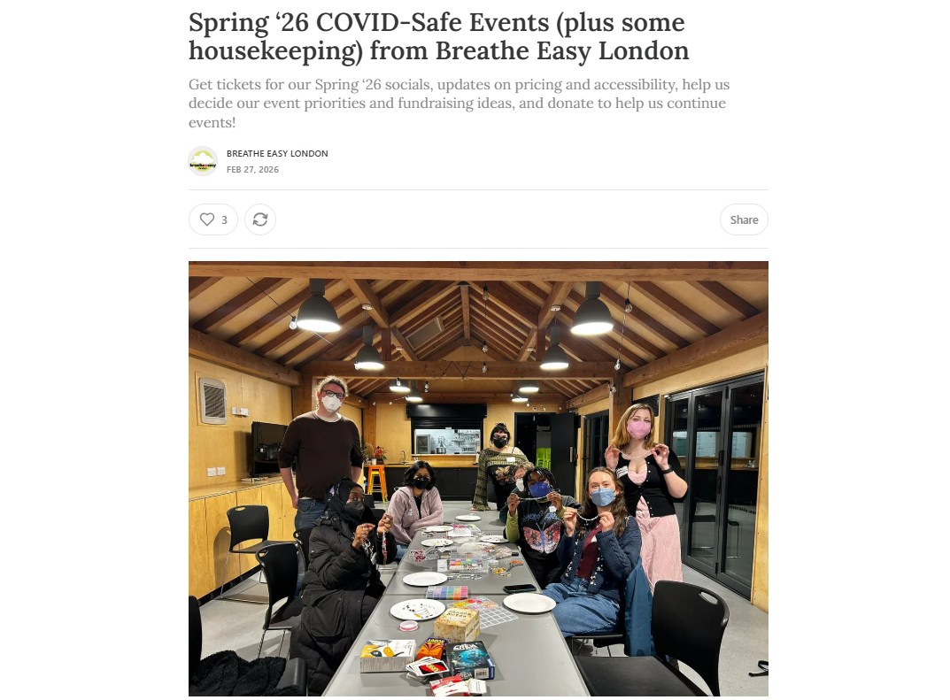 As of 2025, I have cofounded and serve as the Lead Organiser for Breathe Easy London, a COVID-safe event planning group that hosts monthly socials that allow Londoners to find community without risking Long COVID, social isolation, and death.